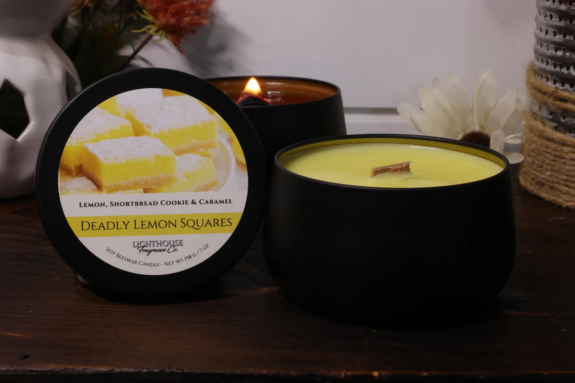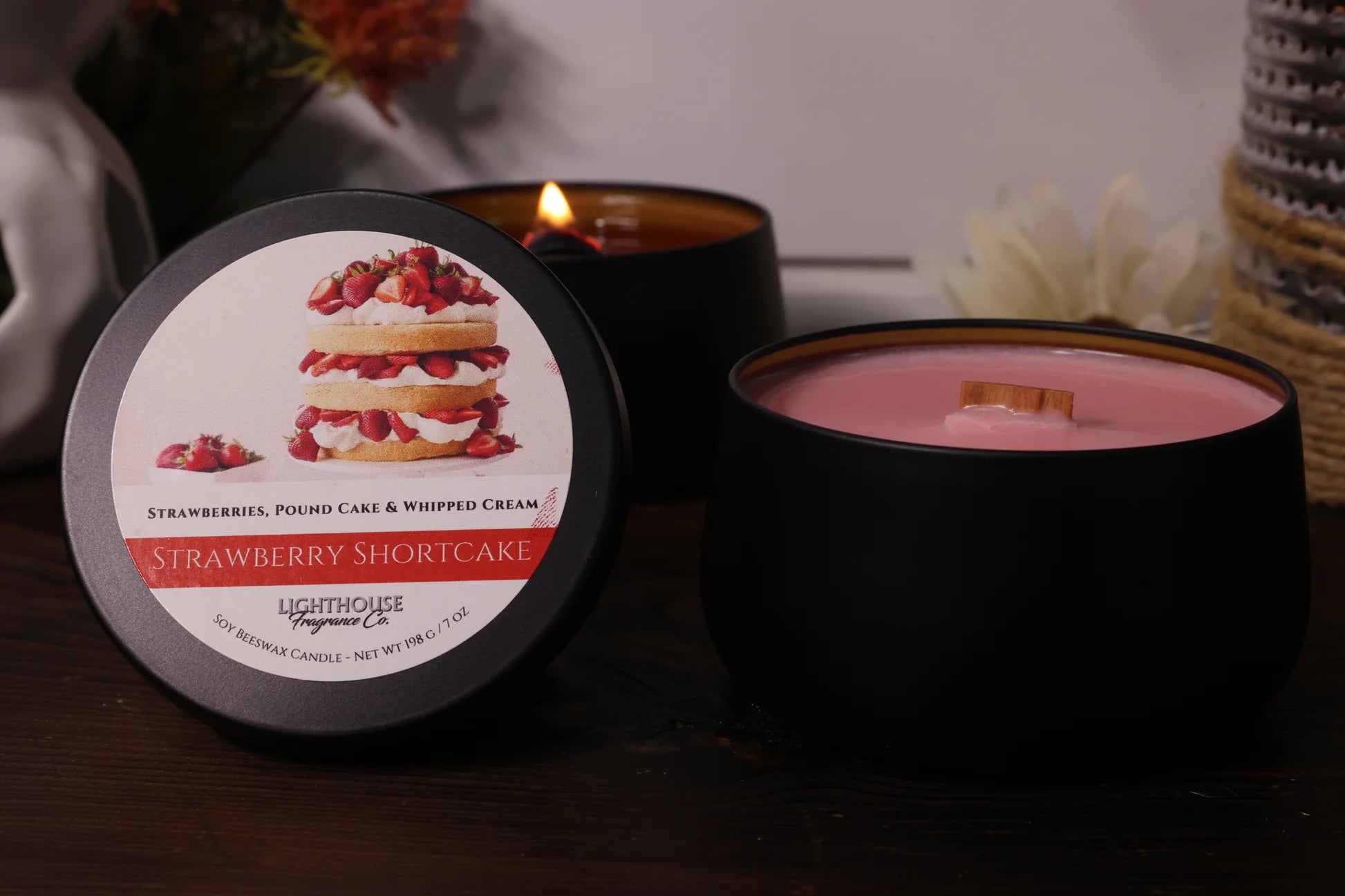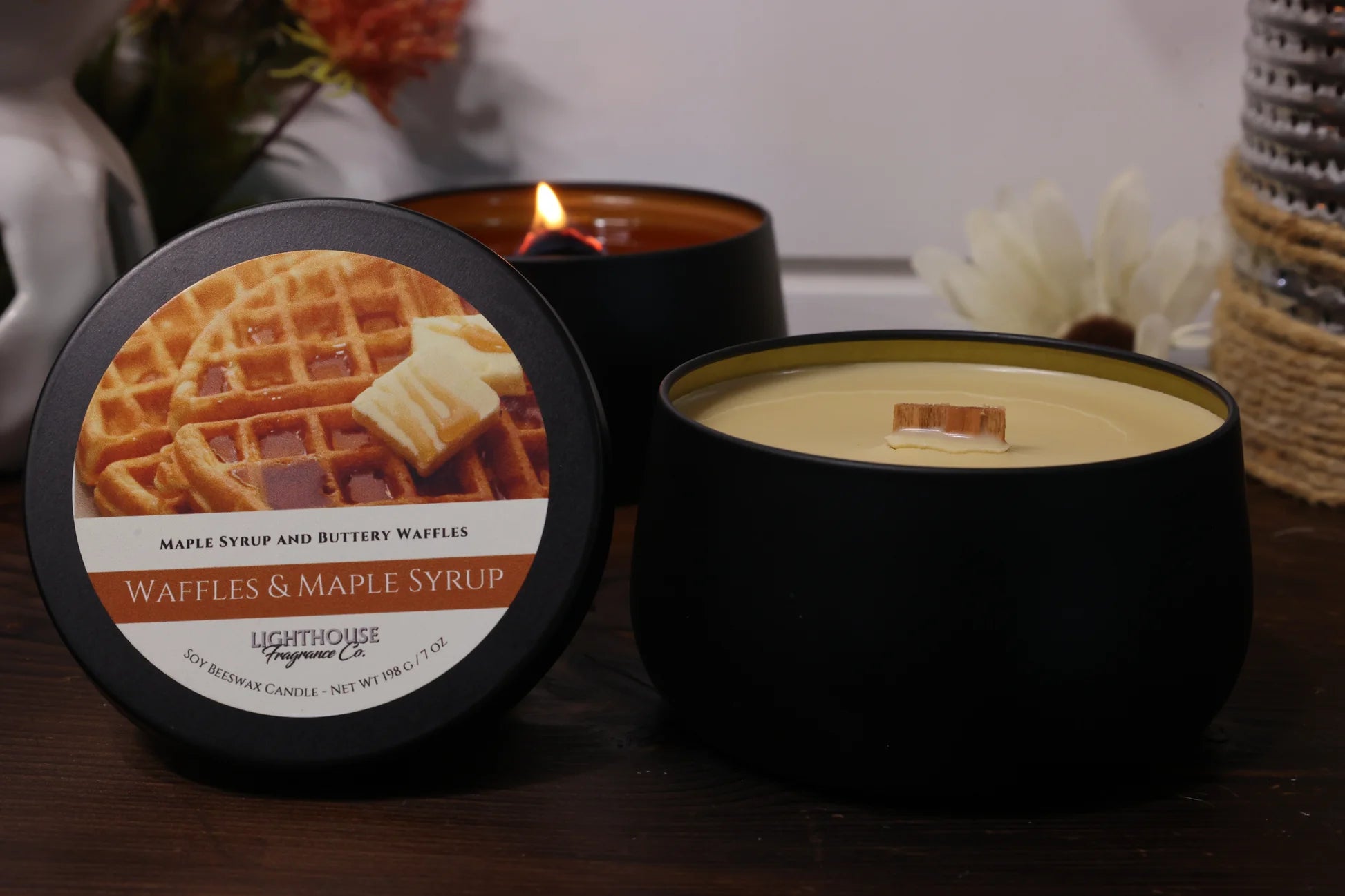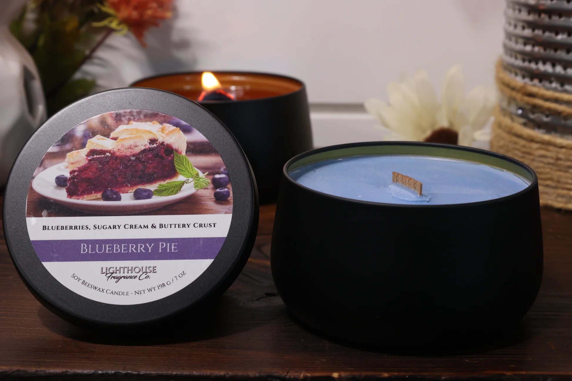 These candles are made with a custom blend of soy and beeswax, premium fragrance oils, crackling wooden wicks & packaged in a black tin container with lid. Each candle contains 7 oz of wax and has a burn time of around 40 hours (depending on the scent and burning habits)
