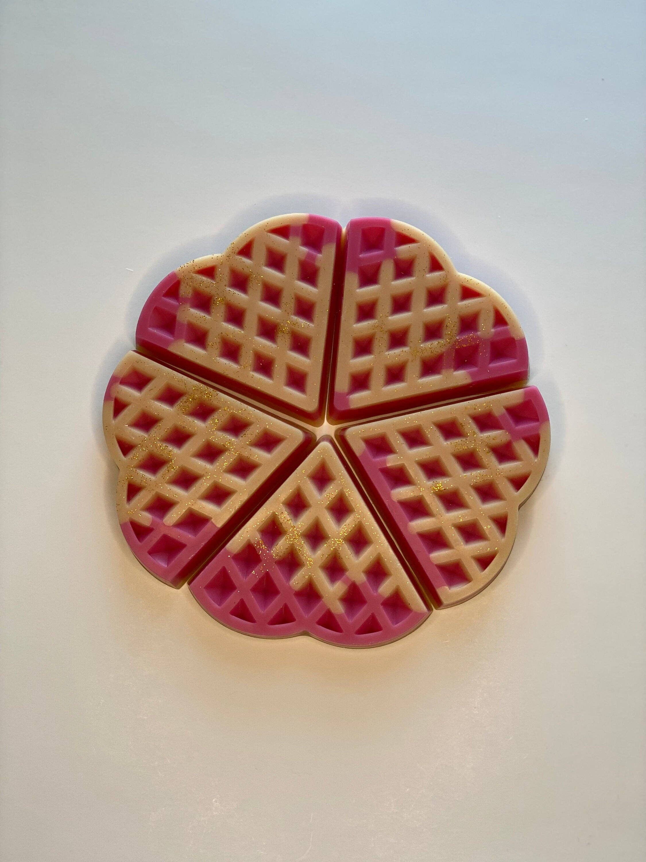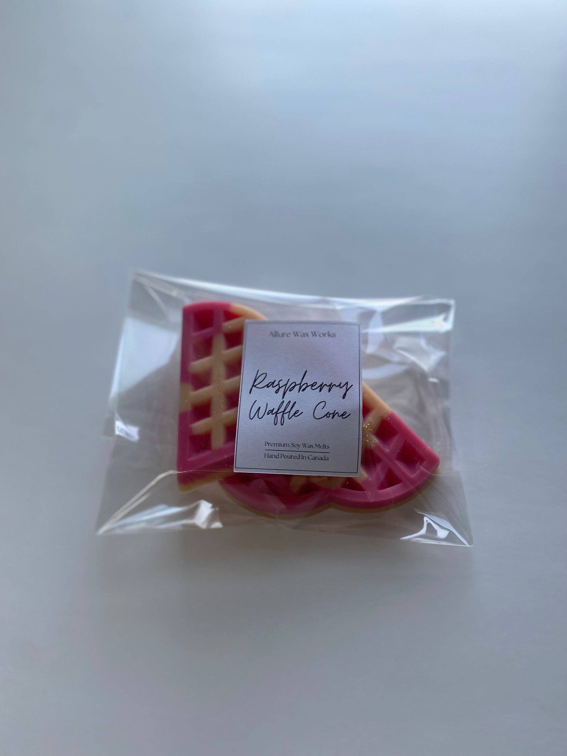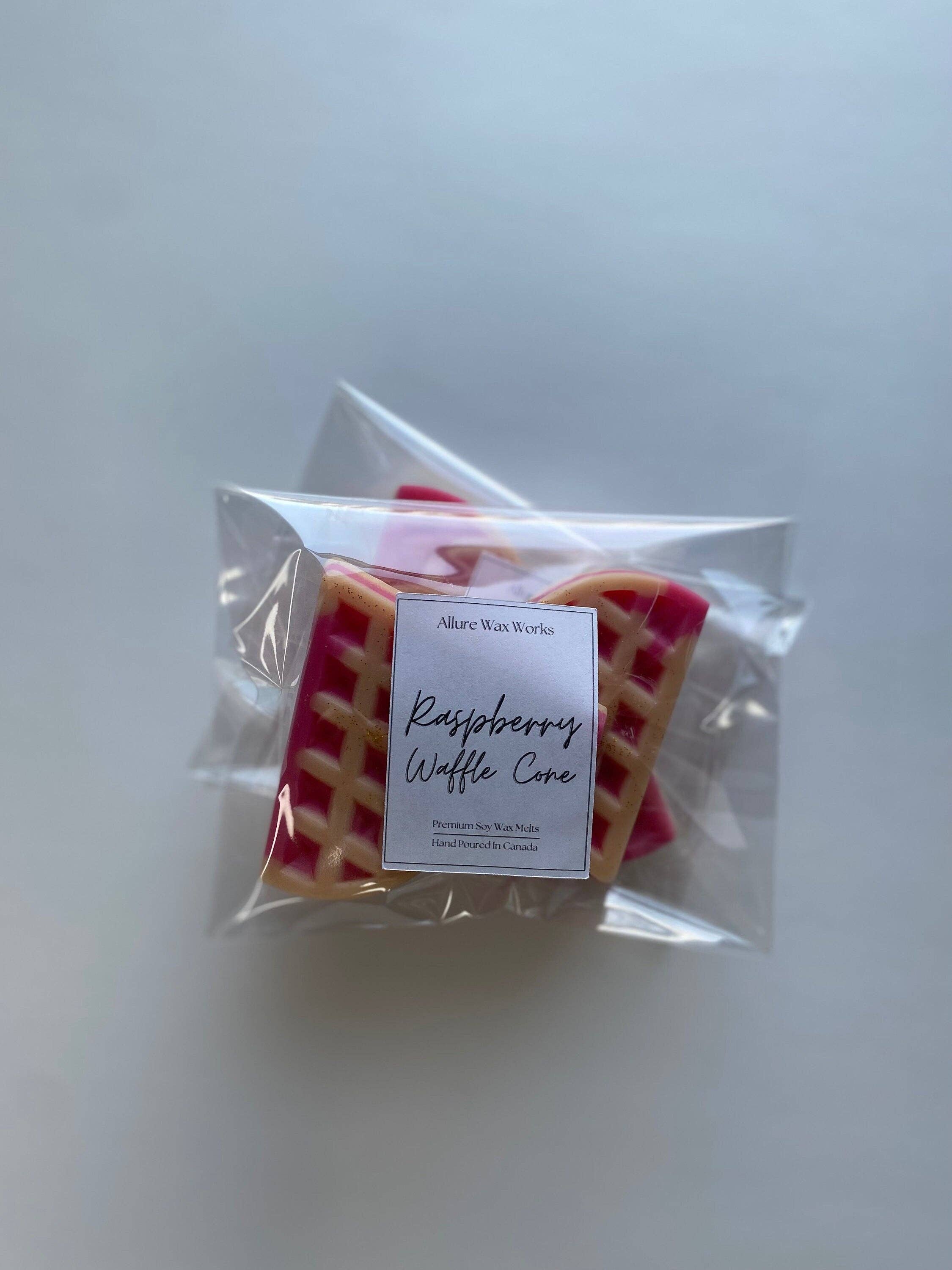These intensely fragrant Raspberry Waffle Cone wax melts smell exactly like a classic buttery and rich vanilla, cinnamon waffle, rolled in roasted sugar crystals, topped with wild raspberries.