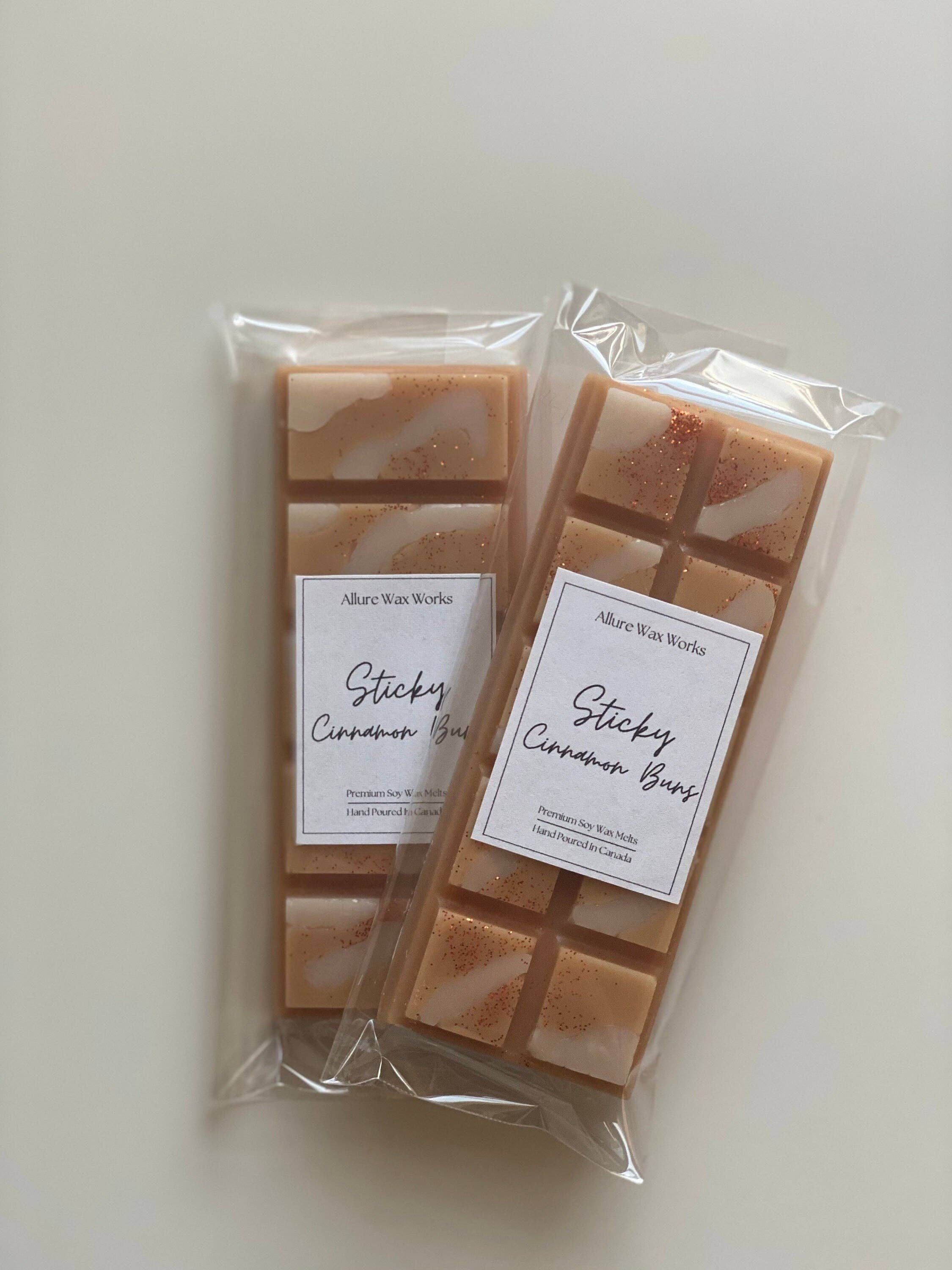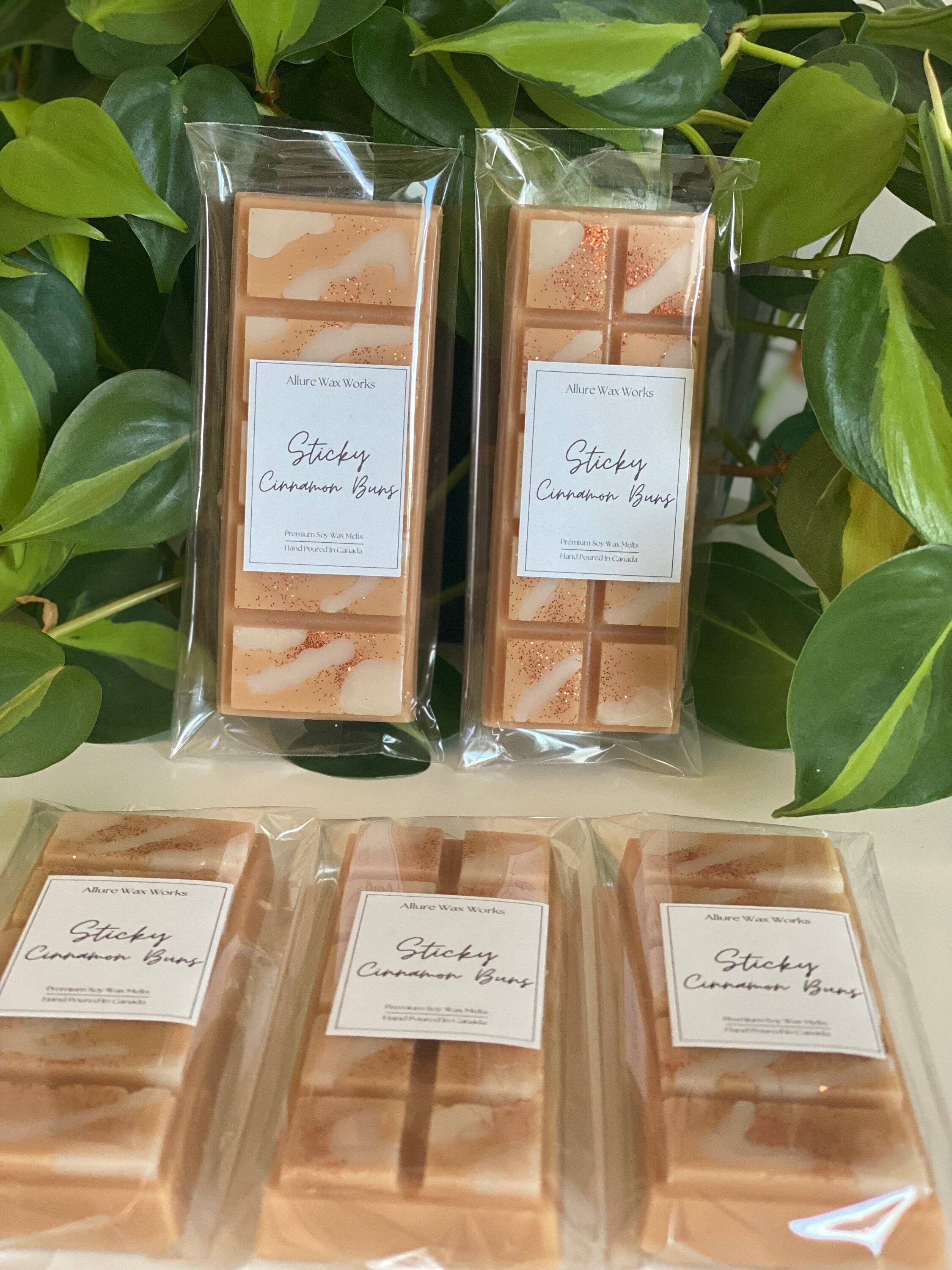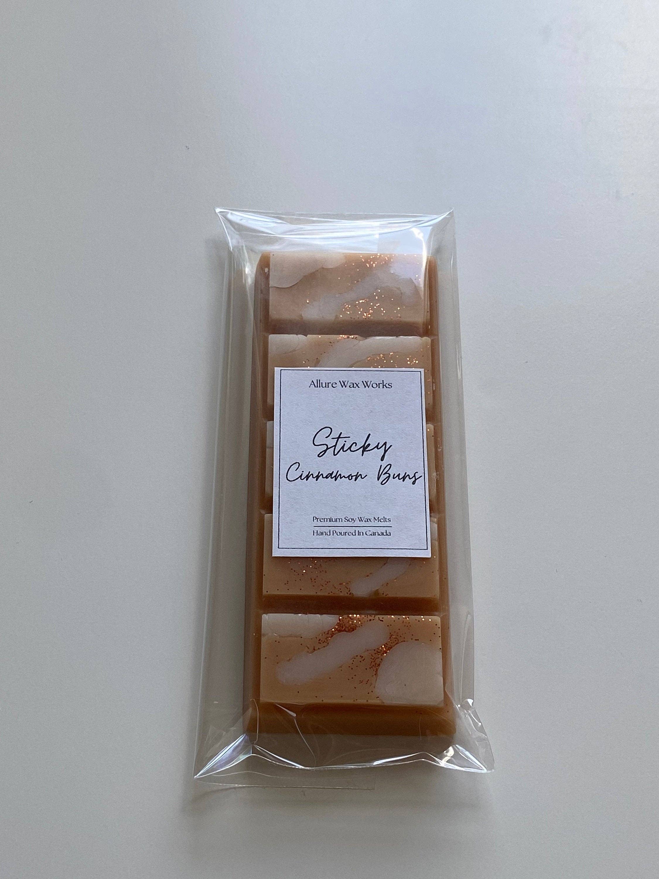 These intensely fragrant Sticky Cinnamon Bun snap bar wax melts smell exactly like fresh from the oven cinnamon glazed sticky buns topped with butter cream frosting, heavy cream, clove and vanilla extract.
