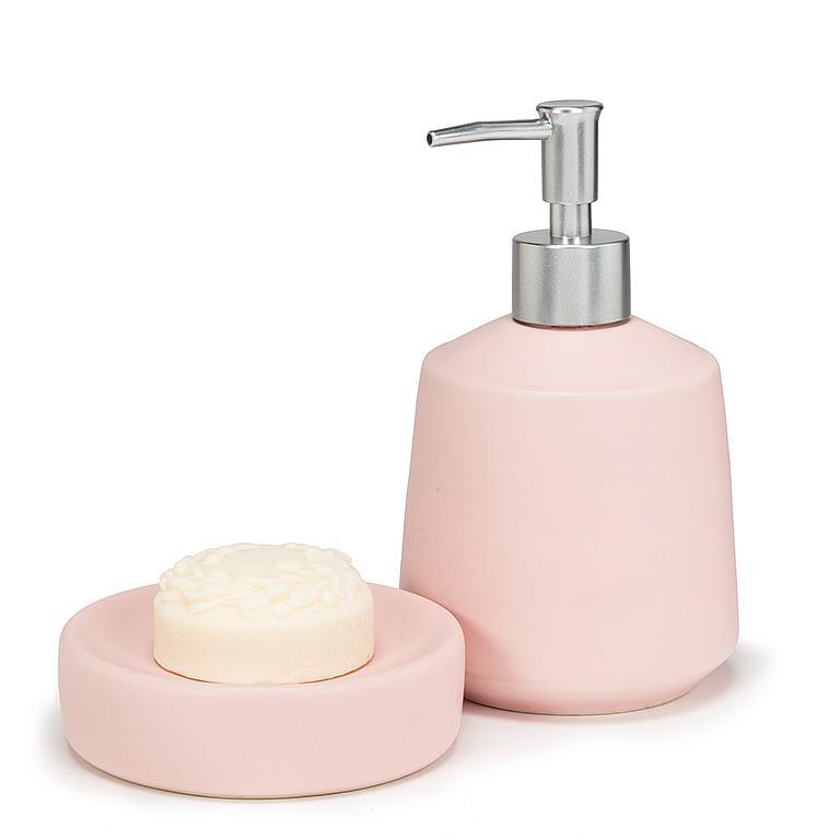 Add some contemporary style to your cleaning with this elegant Matte Soap/Lotion Pump. Crafted out of stoneware, this matte pink dispenser with matching matte-chrome pump makes an elegant accessory anywhere, whether you're moisturizing or washing up.