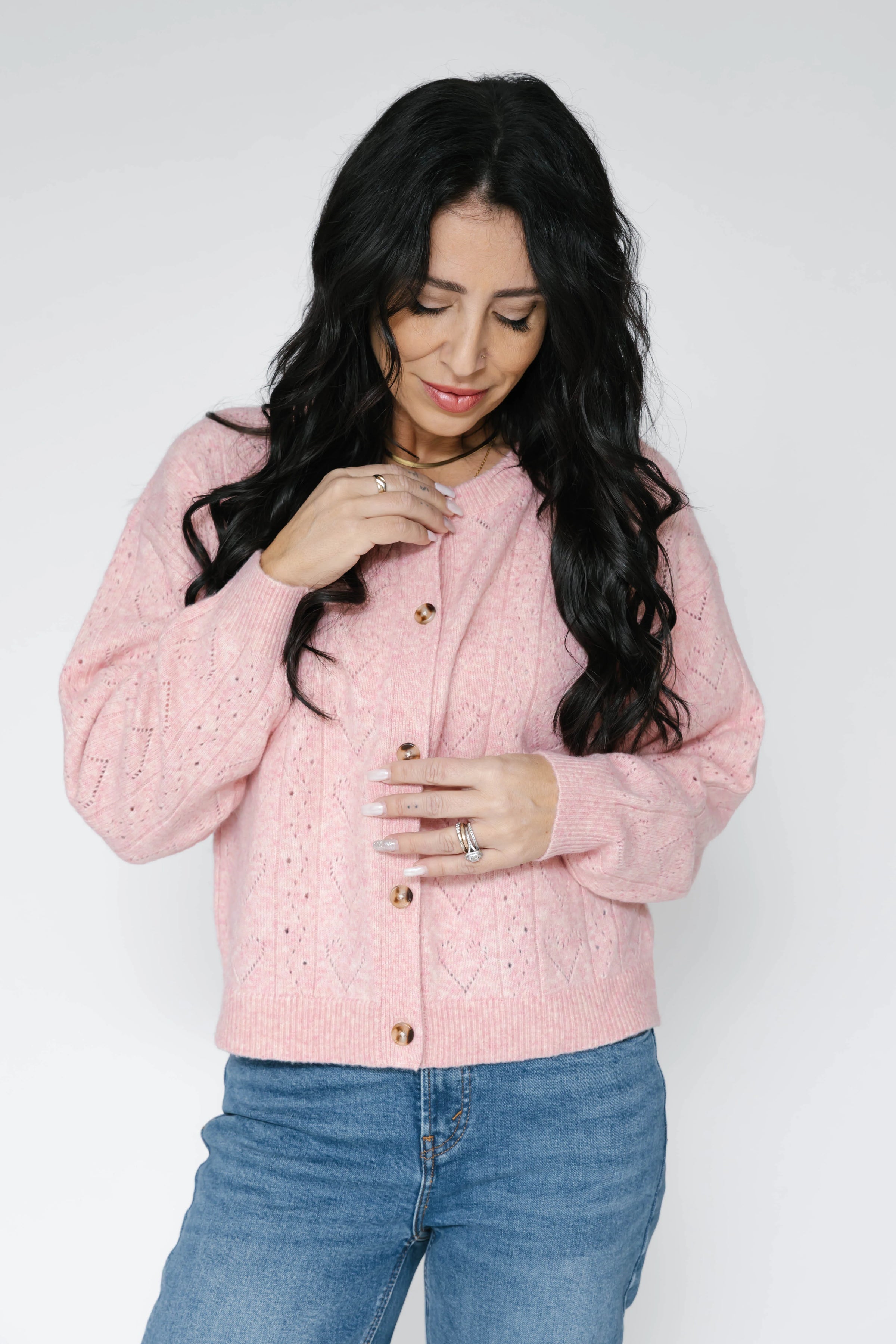 Crushing on cardigans! A closet staple, the Crush On Your Cardigan is made from a soft airy yarn with an adorable heart pointelle detail. Featuring tortoise buttons down the front, full length sleeves and body, you’ll fall in love this silhouette you can wear all year long. Match you mini with the Kids Crush On You Cardigan!