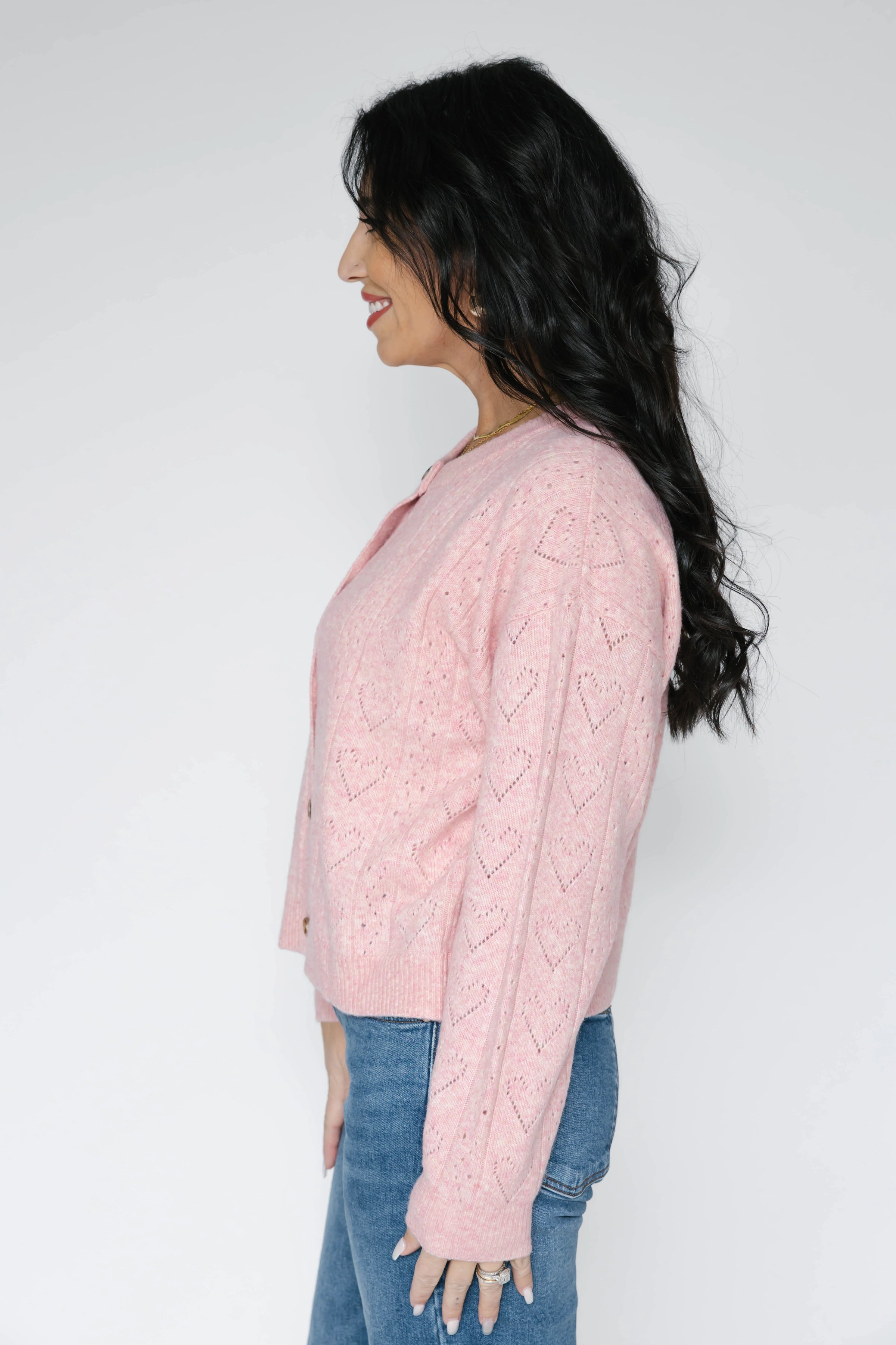 A new cardigan silhouette, with an airy soft yarn and heart pointelle detail