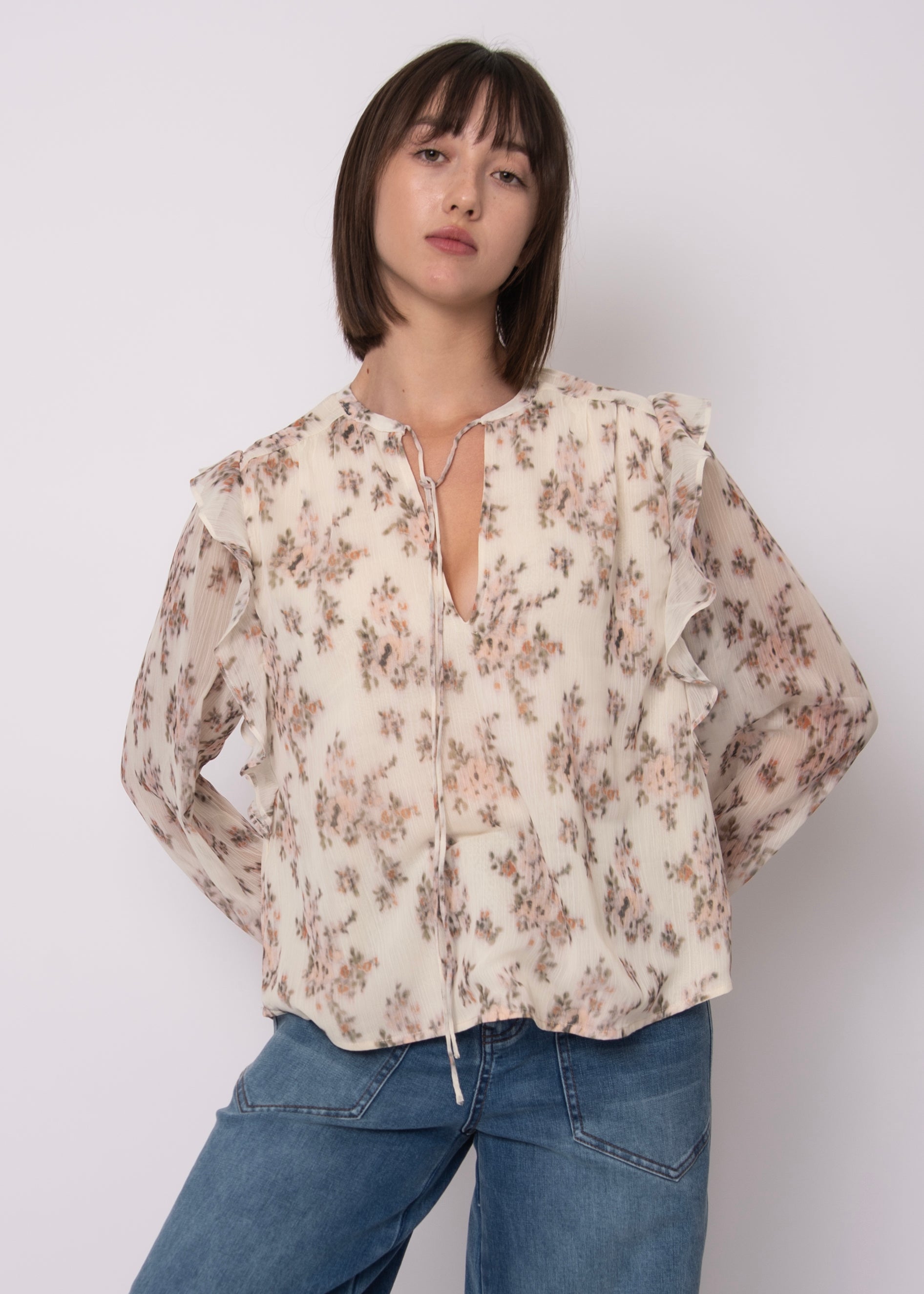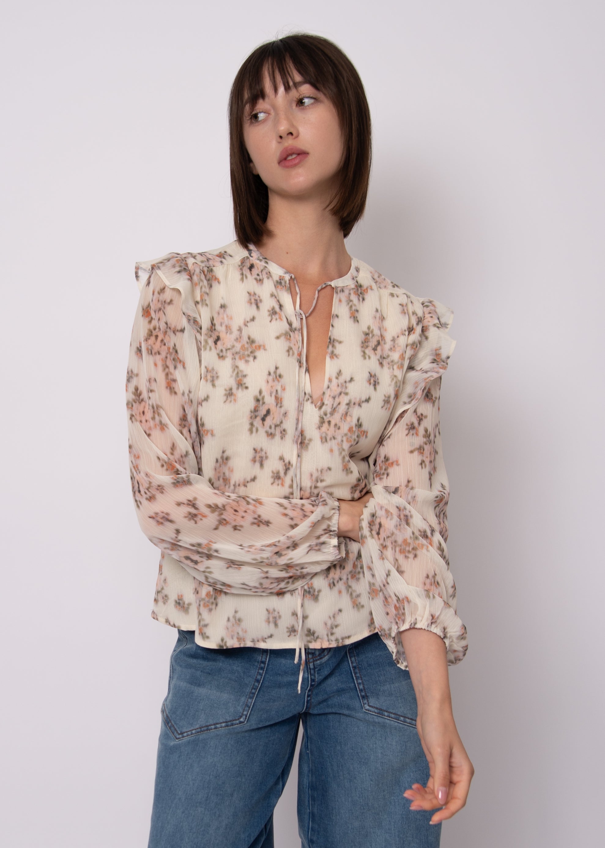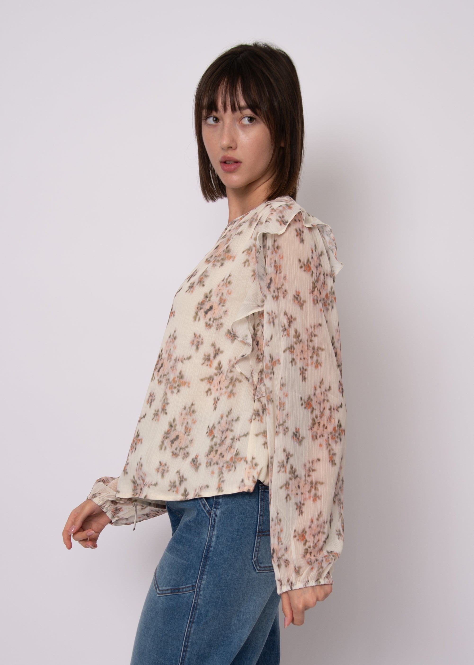 ELFI CRINKLE CHIFFON TOP is an in-season staple piece that combines comfort with an edgy and effortless design, all at a consumer-friendly price point. It features a split neck and crinkled chiffon in a beautiful peach floral pattern.