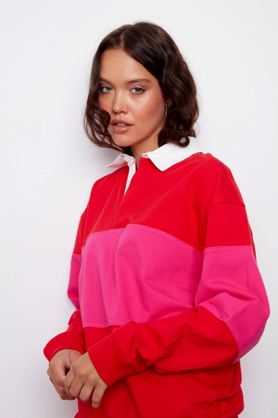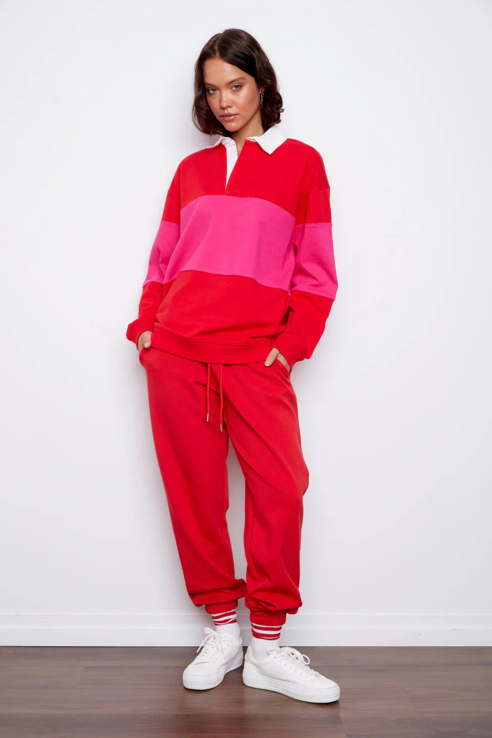 The vibrant color-block design adds a playful, statement edge, making it perfect for pairing with matching joggers or styling back to denim for an elevated off-duty look.