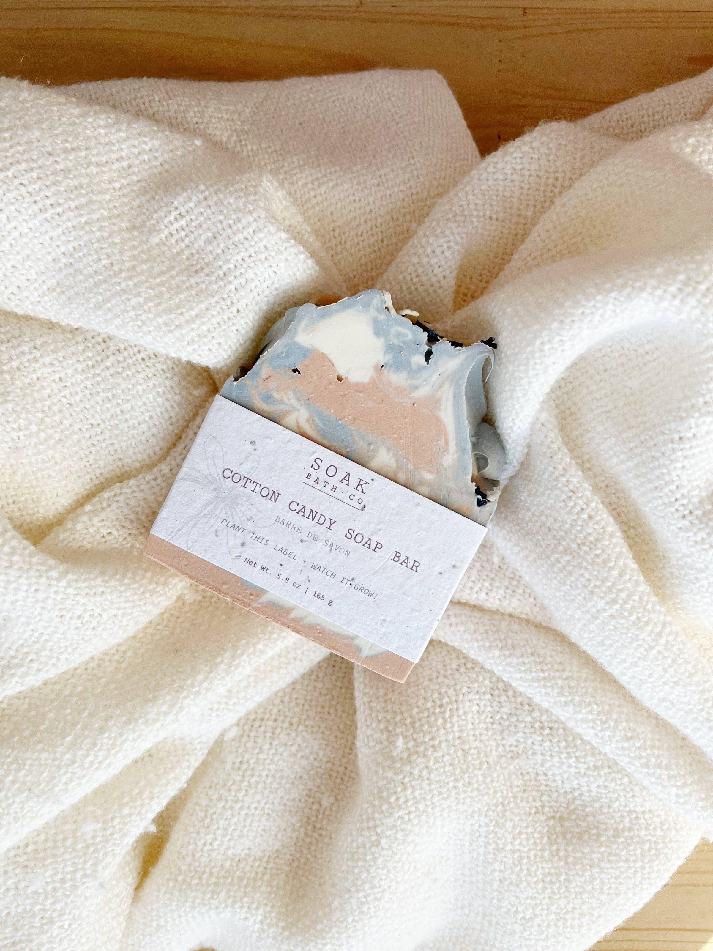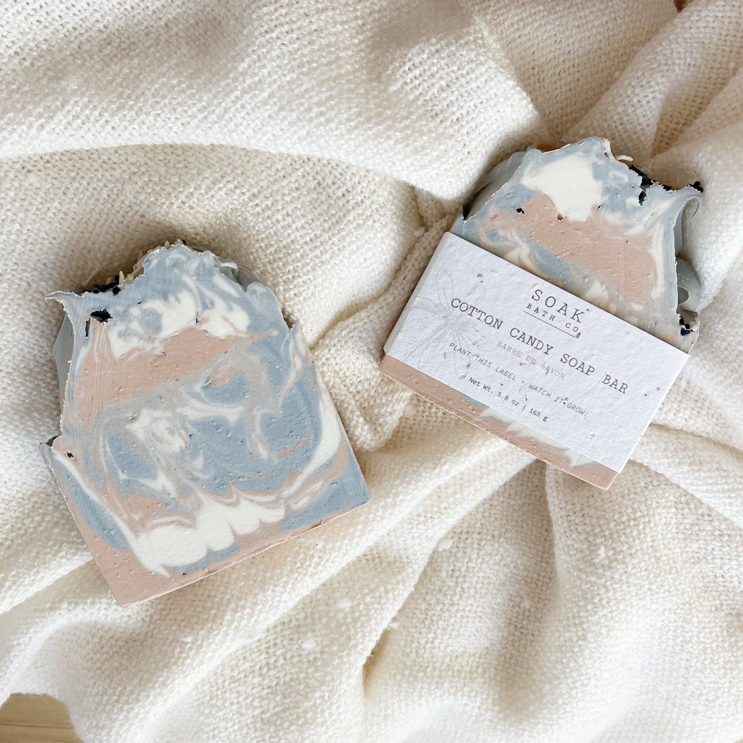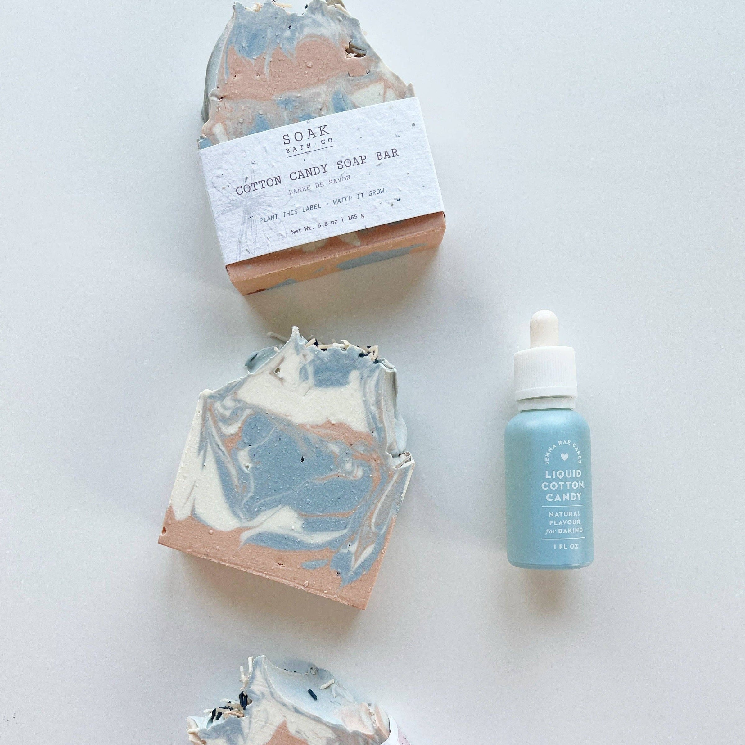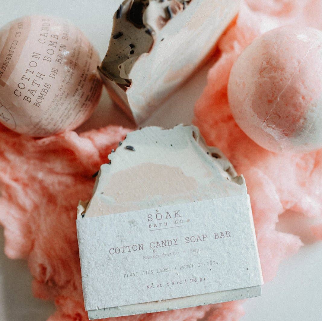The Cotton Candy Soap Bar by SOAK Bath Co was inspired by your favourite, carnival treat and smells like it too! Handswirled with gorgeous light pink and blue cotton candy tones and topped off with soap sprinkles. The perfect gift for the friend with a sweet tooth! This gorgeous bar is completely zero waste and sustainable. The label on each SOAK Bath Co bar is made of biodegradable, plantable seed paper so you can plant the label and it will grow into wildflowers! Proudly Made in Canada.