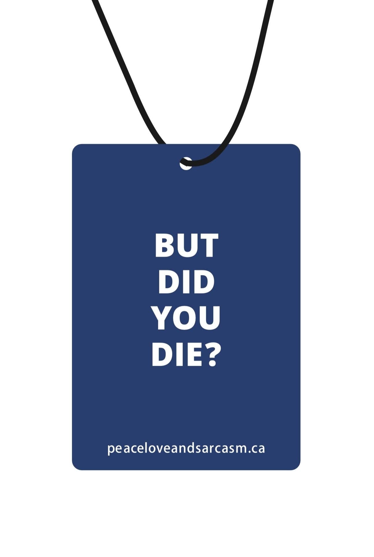 Keep your perspective—and your car—fresh with this boldly humorous air freshener. Featuring the ultimate reality check "But Did You Die?" paired with an uplifting ocean scent, it's designed for drivers who refuse to sweat the small stuff. Every ride becomes a reminder that you're resilient, capable, and definitely still here. The crisp coastal fragrance keeps your vehicle smelling amazing while the cheeky message keeps you grounded. Hang it up and let your sense of humor lead the way. Because the best journeys are taken with a smile and a little perspective. * Ocean scented * Printed on both sides * Size 2.75" x 4"