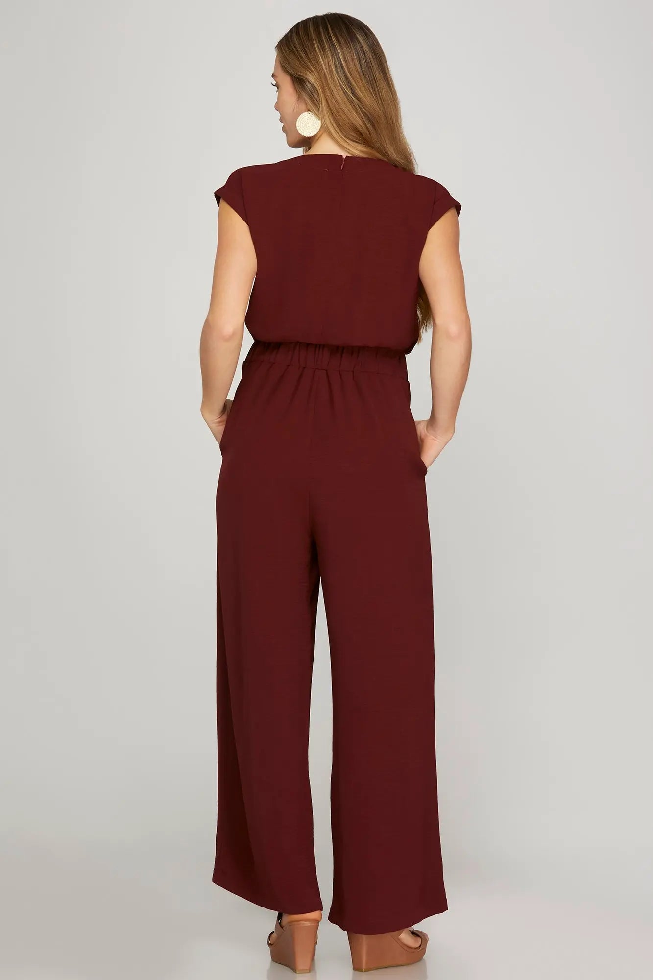SLEEVELESS ELASTIC WAIST WOVEN JUMPSUIT WITH FRONT TIE DETAILMODEL IS 5'7 AND WEARING SIZE SMALL